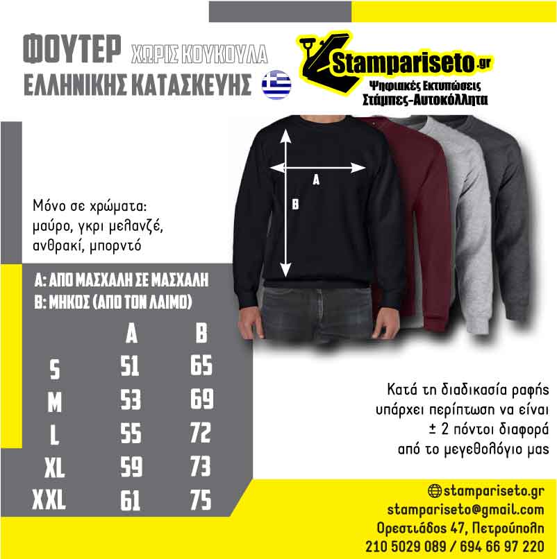 Αγαπητοί μας πελάτες, θέλουμε να εξασφαλίσουμε ότι θα επιλέξετε το σωστό μέγεθος για την καλύτερη εφαρμογή και άνεση στο Μεγεθολόγιο Ρούχων που θα δείτε παρακάτω. Θα βρείτε τις διαστάσεις για κάθε μέγεθος, καθώς και οδηγίες για το πώς να μετρηθείτε σωστά.