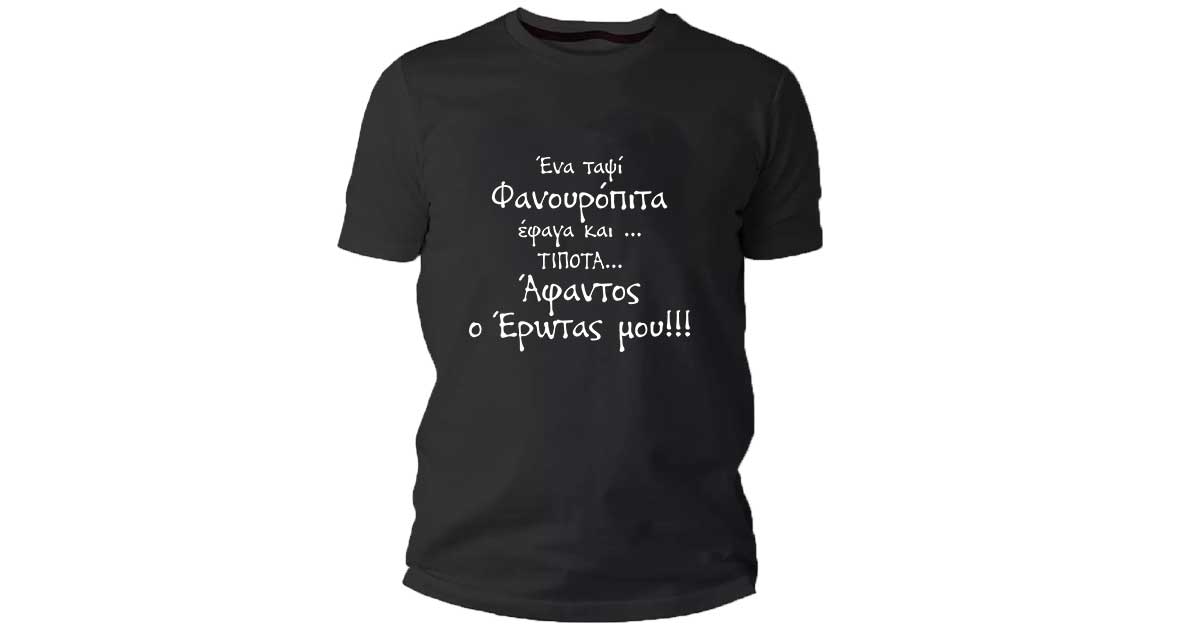 Ετικέτες: Έρωτας, σταμπαρισετο, Άφαντος ο Έρωτας μου Tshirt, σταμπαρισετο αθηνα, φανουρόπιτα, σταμπες, Ένα ταψί φανουρόπιτα έφαγα άφαντος ο έρωτας μου, σταμπες πετρουπολη, Φανουρόπιτα άφαντος ο Έρωτας μου Tshirt, στάμπα σε μπλούζα, εκτυπωσεις πετρουπολη, ektiposeis, ektiposeis petroupoli, σταμπες αθηνα, μπλουζακι, σταμπα μπλουζα περιστερι, προσωποποιημενο δωρο, σταμπαδικο, stampariseto