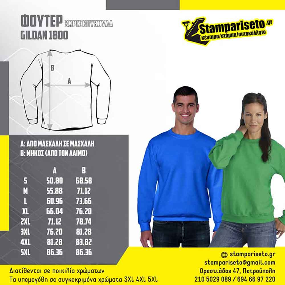 Η εταιρία μας στηρίζει τις Ελληνικές Βιοτεχνίες όπου μας φτιάχνουν (Unisex Ενηλίκων) Φούτερ Χωρίς κουκούλα, Φούτερ Mε κουκούλα και Ζακέτα με κουκούλα. Δείτε το μεγεθολόγιο μας στις Φωτογραφίες του προϊόντος.